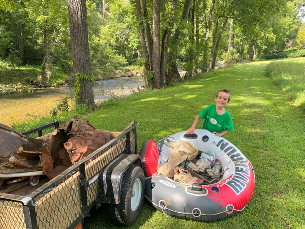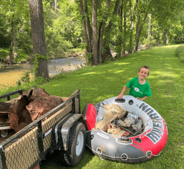 Riley started tubing for trash at 5 years old when he discovered a lot more trash in the Ivy River once we started looking. He created tubing for trash to share in the fun and the cleanup with others who want to get involved and help.
